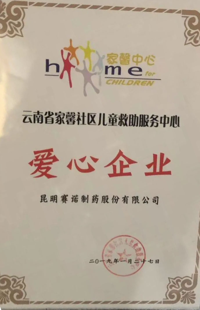昆明賽諾制藥股份有限公司被“家馨”授予愛心企業稱號
